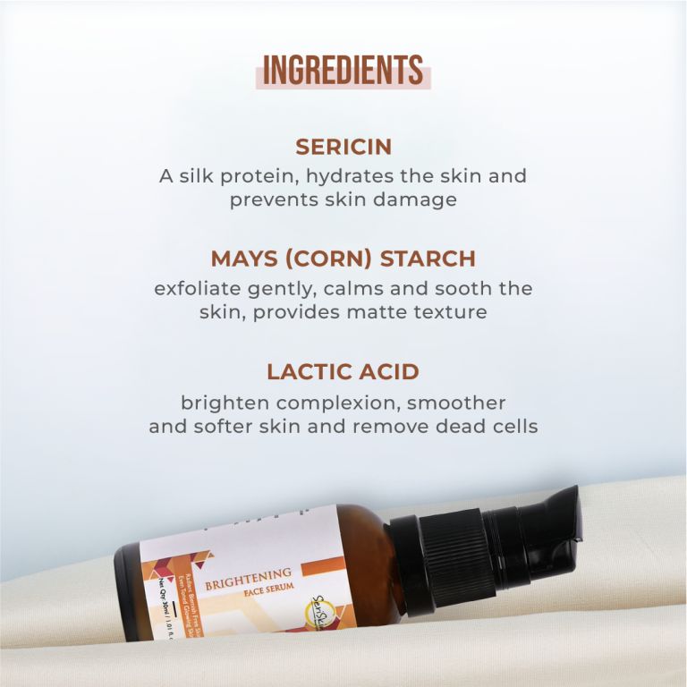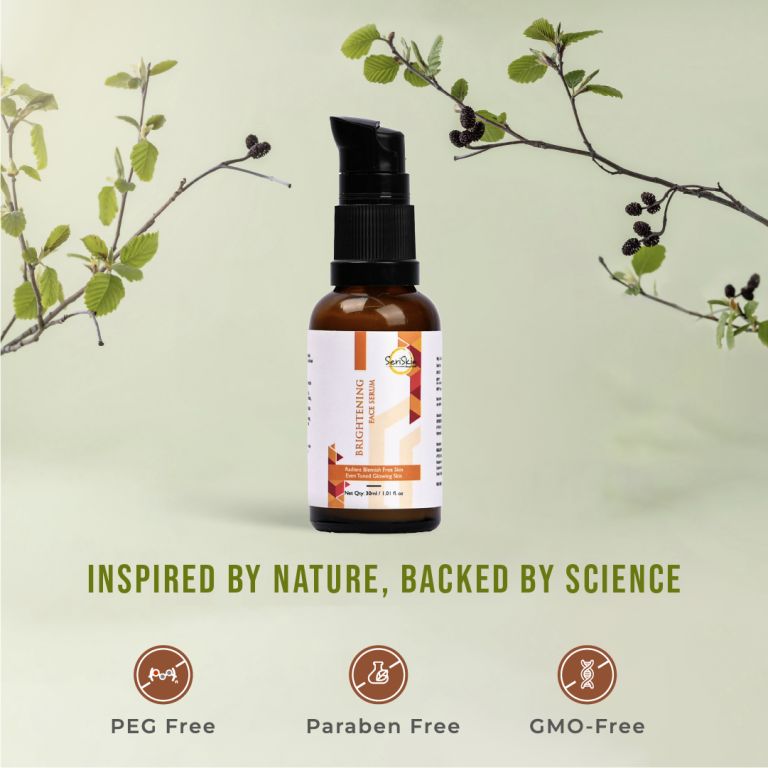 Brightening serum enriched with natural brightening agents for clear and blemish free skin. Improves hyperpigmentation and reduces dark spots. Prevents photodamage and sun damage, repairs the skin and replenish giving silky texture.